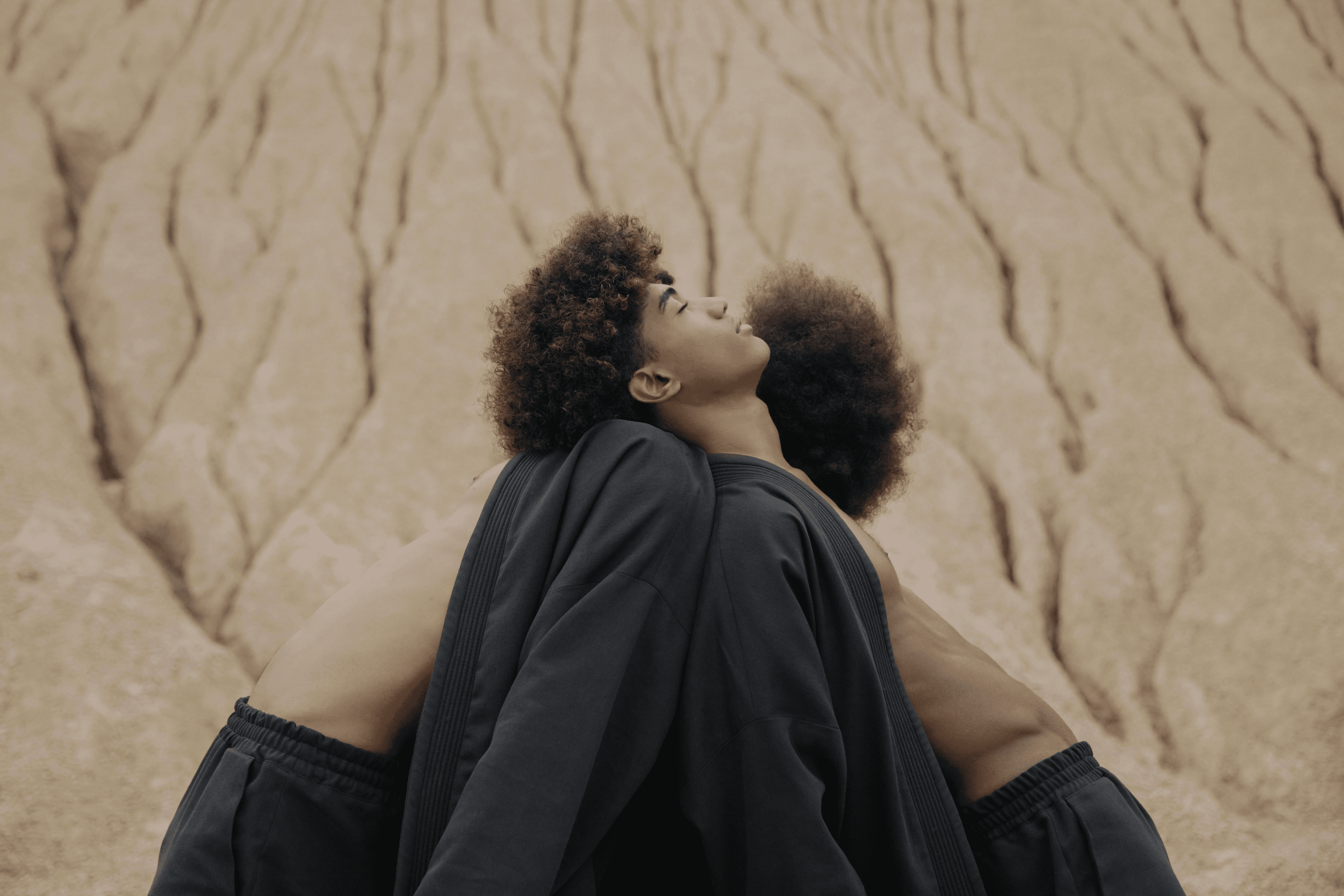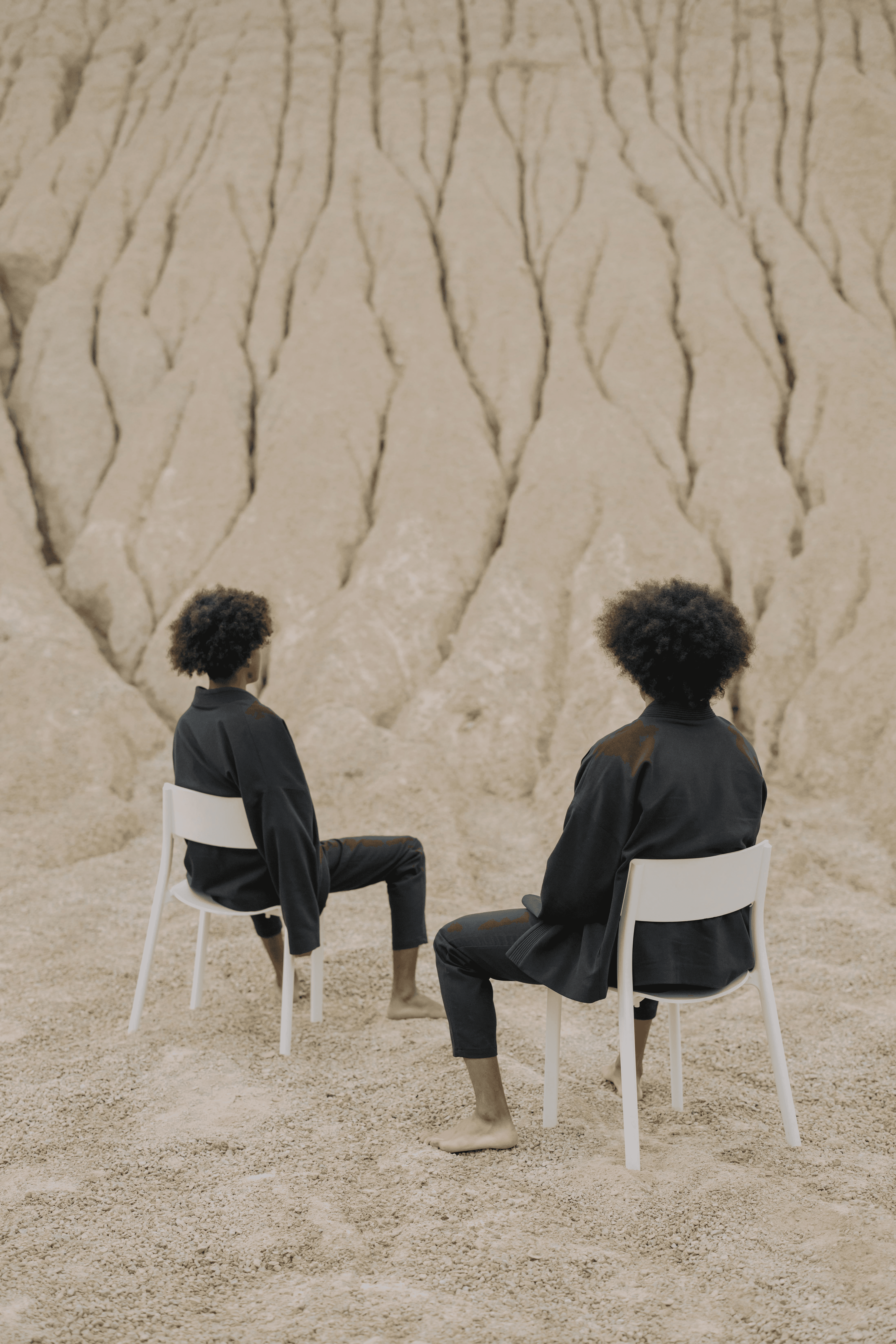In this mineral desert, every pose becomes a quiet question. Two figures, nearly symmetrical, search for each other without meeting. This series explores the idea of inner mirroring, voiceless echoes, and shared solitude—a visual meditation on duality and the resonance of stillness.